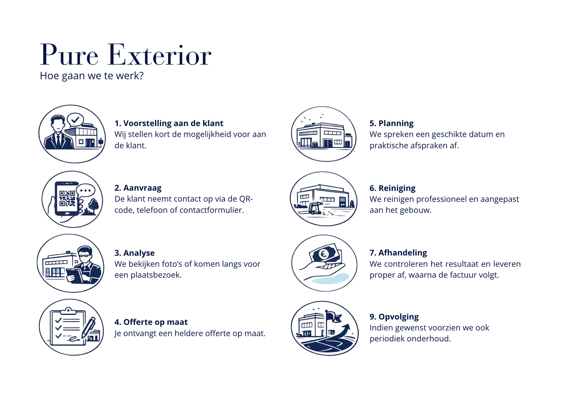 Met een gerichte aanpak zorgt Pure Exterior voor het reinigen en opfrissen van deze zones, zodat uw gebouw en site opnieuw een verzorgde indruk maken. Of het nu gaat om een KMO-site, magazijn, loods of industriële vestiging: wij zorgen voor een oplossing op maat van de omgeving en de vervuiling.